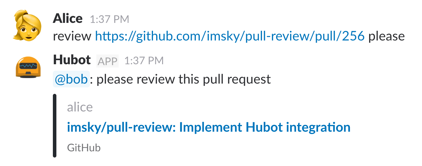 (the same chat channel that Hubot uses, e.g. Slack) and github