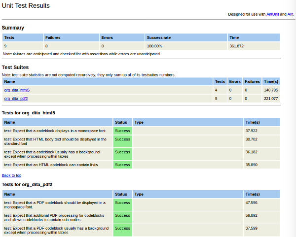 unit-testtransform allows a user to runs a sequence ofditacommands and checks that the documents created match the expected output. This is useful for regression testing, and confirming that any custom plug-ins do not conflict when upgrading the base DITA-OT engine. - The
