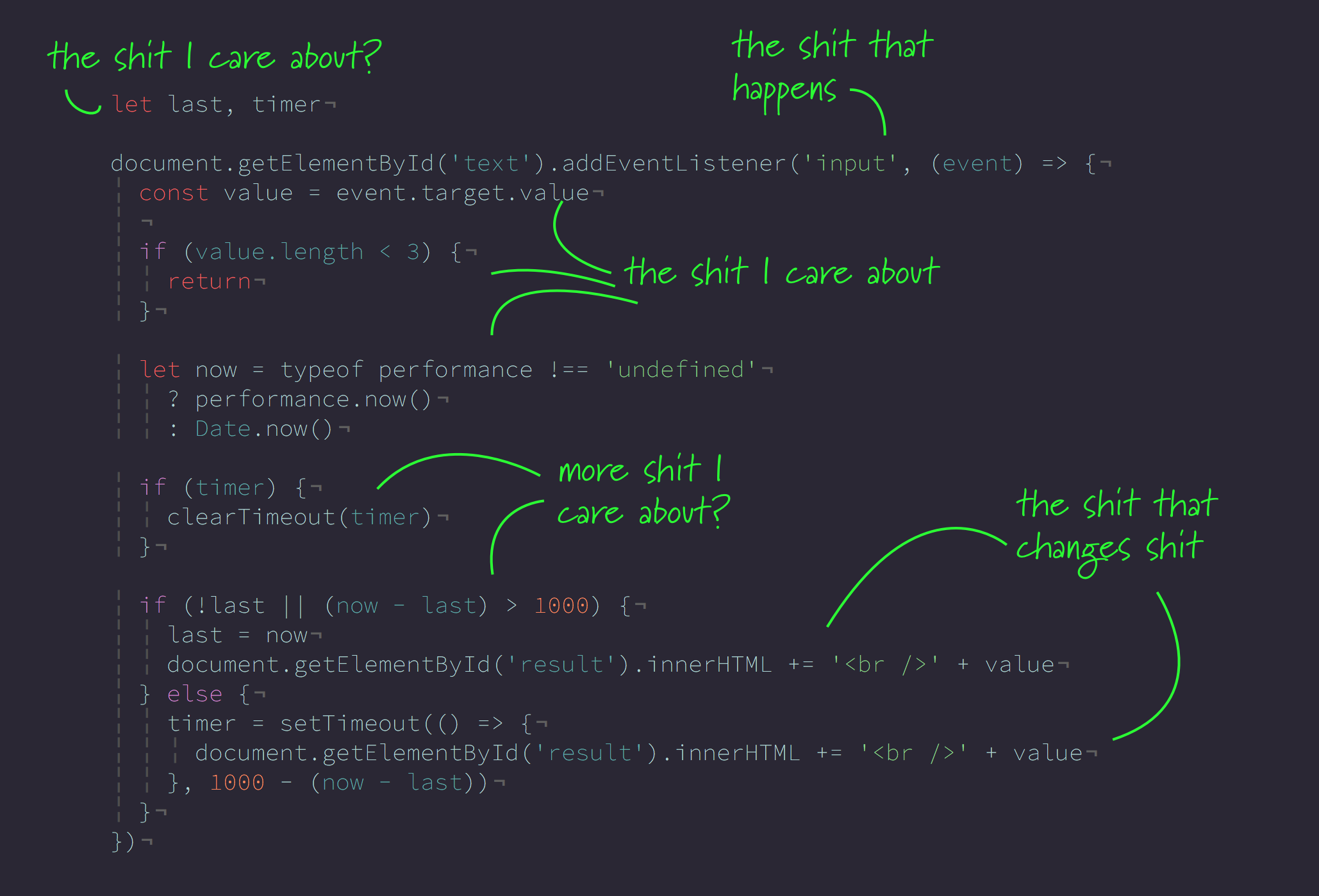 Now, everyone is saying – in public – that these pesky called side effects should be avoided at all costs – while in private they may be doing lavish side effect banquets. But they actually have a point: side effects are where things generally go wrong. And we don't want things to go wrong, don't we? That's because side effects change things out of our control, so they may have unpredictable results. Therefore, clearly separating our processes from our side effects makes testing the processes a breeze, leaving the side effects very clearly defined, so we can build a strong fortification around them – to make them less unpredictable – and see clearly what to blame when shit hits the fan.