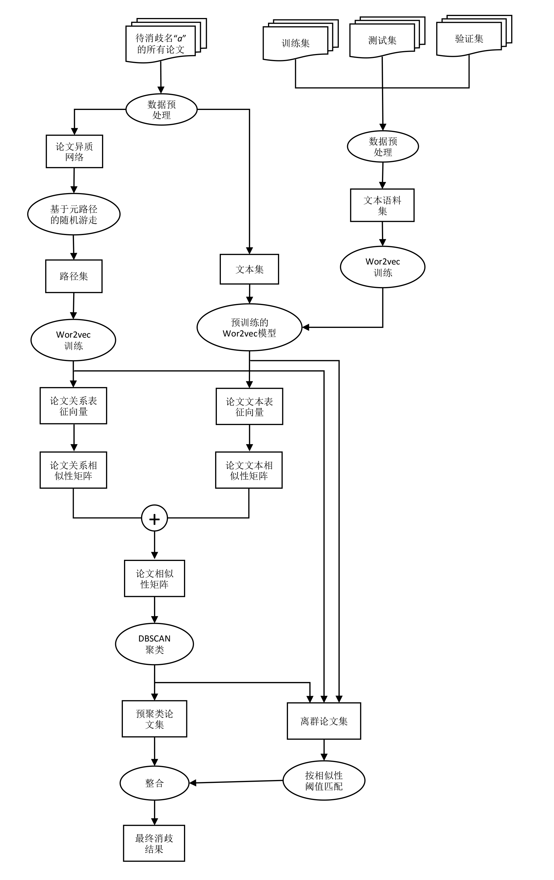 对于某个需要消歧的名字,根据其所有论文之间的关系信息和论文文本信息求出论文表征向量,进而求出论文之间的两两相似度,得到论文相似性矩阵,使用聚类算法和基于相似度阈值的匹配方法将论文划分为不同的簇,则每个簇代表一个特定作者的论文集。