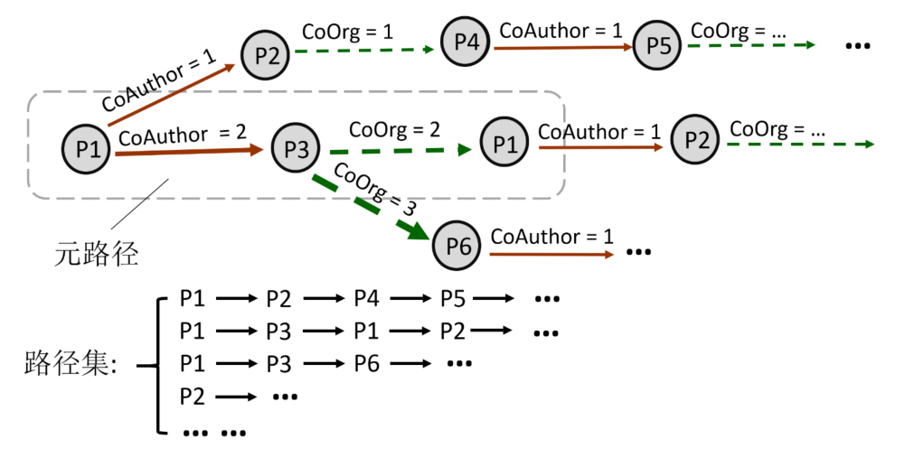 在某些情况下,有些关系对于一些论文来说是缺失的,例如某个论文中所有的作者并没有出现在其他任意一个论文的作者列表中,那么对它来说CoAuthor这个关系是缺少的,当出现这种情况时,就采用更灵活的策略,即根据元路径中当前缺失关系的下一个关系游走,对于上面说的那篇论文来说,就转而根据它的CoOrg关系进行游走。