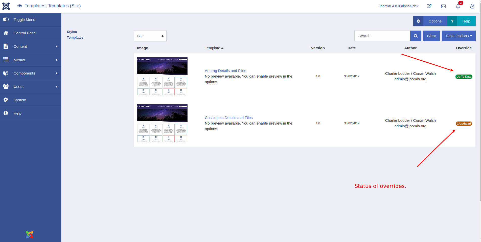 * Load correct core files of override files (#2) Start implements loadcorefile() in administrator/components/com_templates/Model/TemplateModel.php * CS (#3) Coding Standards * codingstandards * codingstandards (#4) * Test (#6) Phase 2 (2 part) Mechanism to find correct core file and implementation. * Remove Notice: Only available for html-folder * Remove Warning if core file not found (#11) Thanks. So one part of the issue #12 is done. * Implement the diff view in template manager Implement the diff view in template manager * coding standard (#17) * fix diff (#18) Fix bug in path in case of administrator template override. Fix bug in path in case of administrator template override. * Notification after update and TEST (#16) Find changed files of overridden files and show message. * coding standard (#21) * correction * correction (#26) * Correcthtmlpath (#27) * correction * change oldhtml to newhtml * List of updated override files. (#30) * addcss (#34) * Final Product (#39) Core and Diff view Updated override history list. Quick icon notification plugin. Override control plugin. * save 3 lines :) * New feature show status. (#47) show status in com_template view templates * link * corrected namespace * Button to Switch (#35) * wip add Switcher * wip style switcher * wip style switch make inline and change on off text * wip start with js * wip js * wip delete buttons and make js more robust * wip save to storage * wip delete old code * wip * wip lint * wip css * set default value for switcher * wip make switcher blue * wip * wip * build * correct names * create new functions * fist test code * use onchange * undo installer.min.js * add forgotten new line at the end of css file * correct align * correct compare.es6 - only deleted the toggle part * correct compare.js - only deleted the toggle part * wip * reduce timeout * wrap in funcitons * wip * add use strict to both js-files(compare and toggle) * add the timeout value of 500 again, because 200 are not enought in my case * use css class 'active' for toggle views * add strict * time out for editor * wip * improvments use newActive and switch * correction * width of switcher-spans * correct align * do not use global * wip * removed timeouts * JTEXT to TEXT * forgotton last line * deleted duplicated comments * css fix align * use unnamed functions in es6 * Sql files for fix database (#50) * sql files for database fix * delete space * Suggestion for displaying Dates in view updates files (#52) Correct Dates and do not use date of file any more * Store Date as UTC and show it in server time zone (#57) * modified and created date are created and stored in UTC * convert dates for displaying in model * spar a loop * normalize timezone in view * use language constants for dateformat * JToolbarHelper to ToolbarHelper * CS * namespace * plural * name * clean * text * fx * sin * files * s * Suggestion for language strings (#60) * language strings * correct typo * delete media folder plg_quickicon * add folder plg_quickicon to build/media_src * delete files in media folder * Move media folder - System (#66) * multi * cs * delete files in media folder for joomla toolbar (#67) * Fix button switchers style. (#70) * button * CS * changed uitab.addTab for updated files * Bring back core.js changes. (#69) * core.js * const * fix * form * core * hound * CS * scopr * grid * alpha * cs * lang * only override file * lang * override lang installer * Cs * sub * Update list of core extensions (#71) * Language changes (#76) * update * Update en-GB.com_templates.ini * override JLIB_HTML_PUBLISH_ITEM this is the hover text on the publish icon in the list of files * Change icon (#74) change the icon to use an outline for more consistency * lang * not core (#75) * not core * Update en-GB.plg_installer_override.ini * namespace * cs * Updated files (#82) * Update default_updated_files.php * Update en-GB.com_templates.ini * Update en-GB.com_templates.ini (#81) * Update en-GB.plg_quickicon_overridecheck.ini (#80) * Update en-GB.plg_quickicon_overridecheck.ini (#79) * remove space (#78) * Update en-GB.plg_quickicon_overridecheck.ini * Update en-GB.plg_quickicon_overridecheck.sys.ini * remove hardcoded id * null get function * state * clean * More changes "core" to "original" (#85) * cs * update * plural