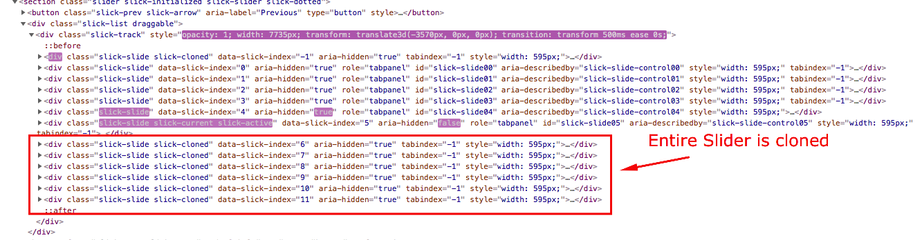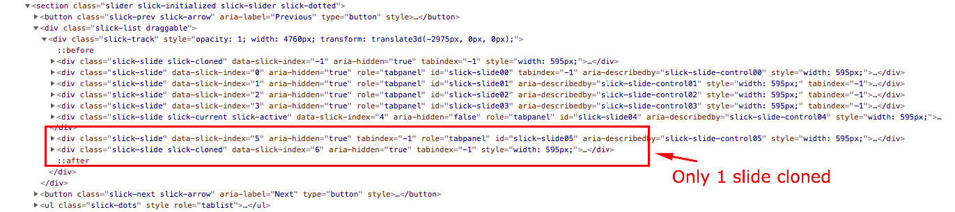 Notice how only the first slide is cloned at the end of the slide, which is all we need since slidesToShow is just 1.