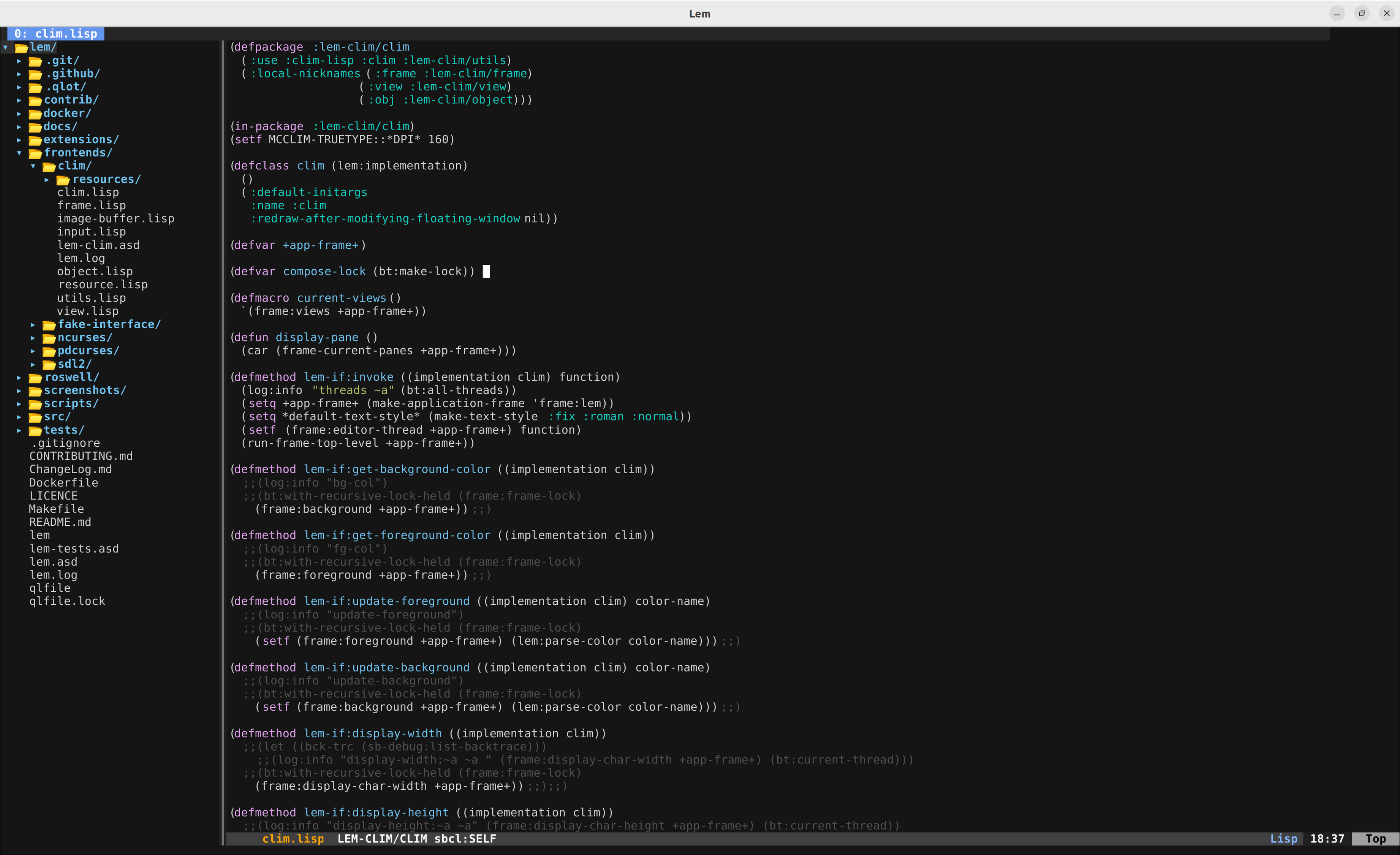 I have a few specific questions about the internals of Lem. Mainly I'm confused about the proper format for events sent to Lem and what some of the drawing-object's are supposed to represent (like eol-cursor-object or extend-to-eol-object). I haven't been able to get a good understanding looking through source. Also would appreciate any input on what I've done so far... currently working on a fork of lem here all the work is in frontends/clim. If anyone can spare a few minutes to chat that'd be great. I've been taking a stab at this, as a personal project... Hoping to get more familiar with CLIM and Lisp. |