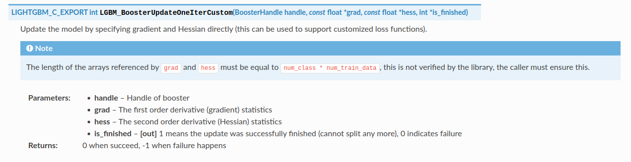 There is a LGBM_BoosterUpdateOneIterCustom doing the needed update, but it only takes grads & hessians: