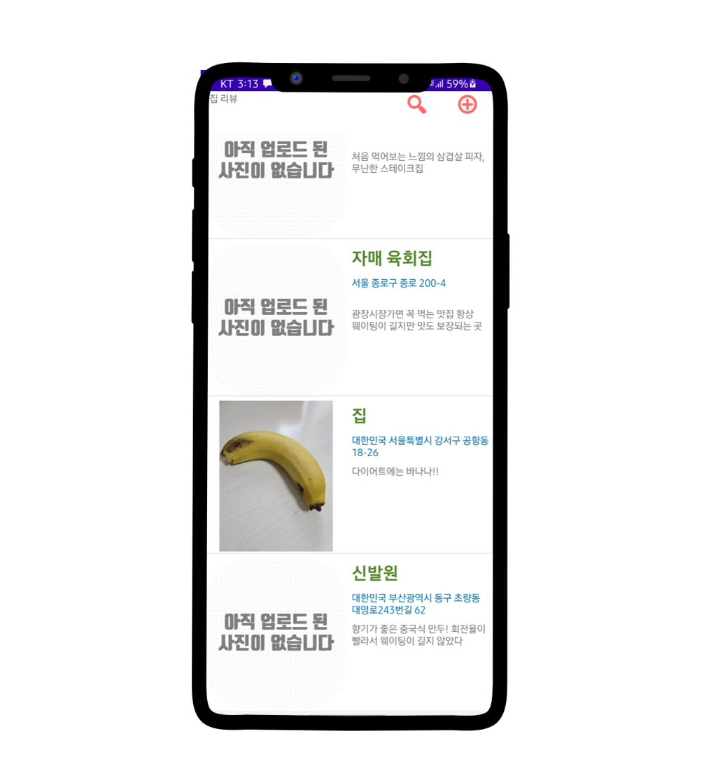 전체 맛집 리뷰 보기 사용자가 리뷰를 입력, 수정, 검색, 삭제 할 수 있는 액티비티입니다. 간단한 정보만 작성 가능했던 1학기 레포트에서 더 발전해 사용자 위치를 기반으로 한 "위치 검색" , 파일 외부 저장소의 앱 전용 폴더에 직접 촬영항 사진을 저장하는 "사진 등록" 기능이 생겼습니다.