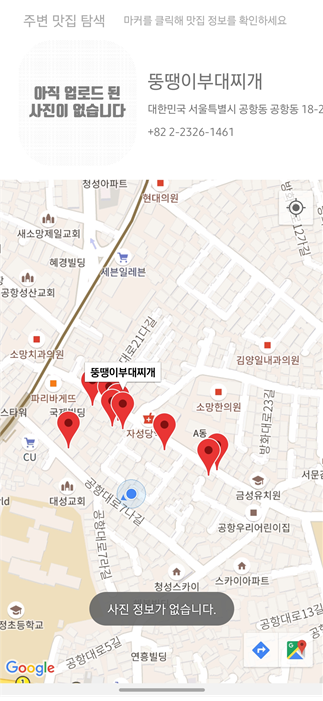 맛집 지도 맛집 지도는 사용자 위치 주변의 식당을 검색해 지도에 마커로 표시해줍니다. 사용자가 마커를 클릭하면 해당 식당의 정보(이름, 주소, 핸드폰 번호, 사진)를 확인 할 수 있습니다.