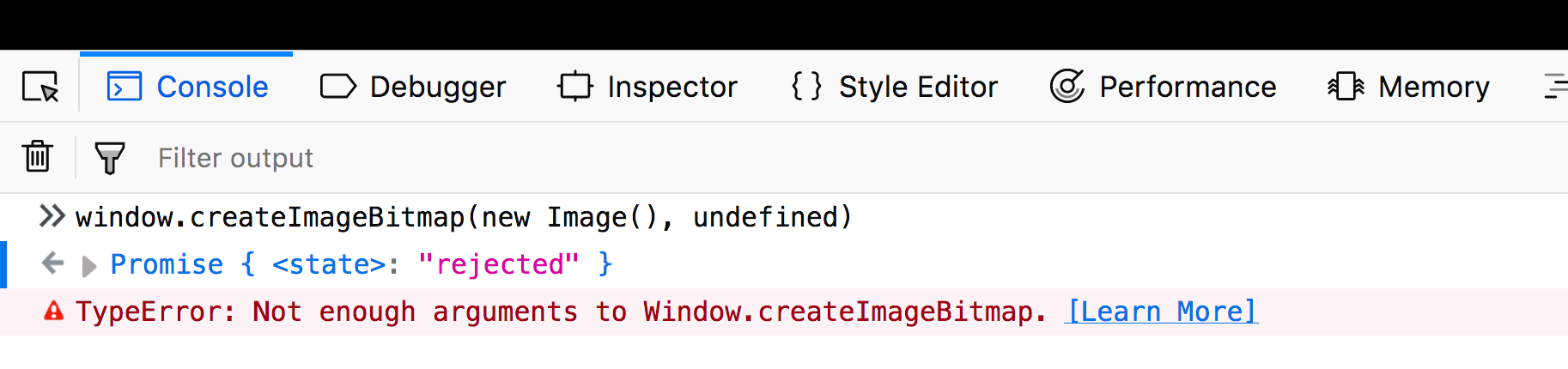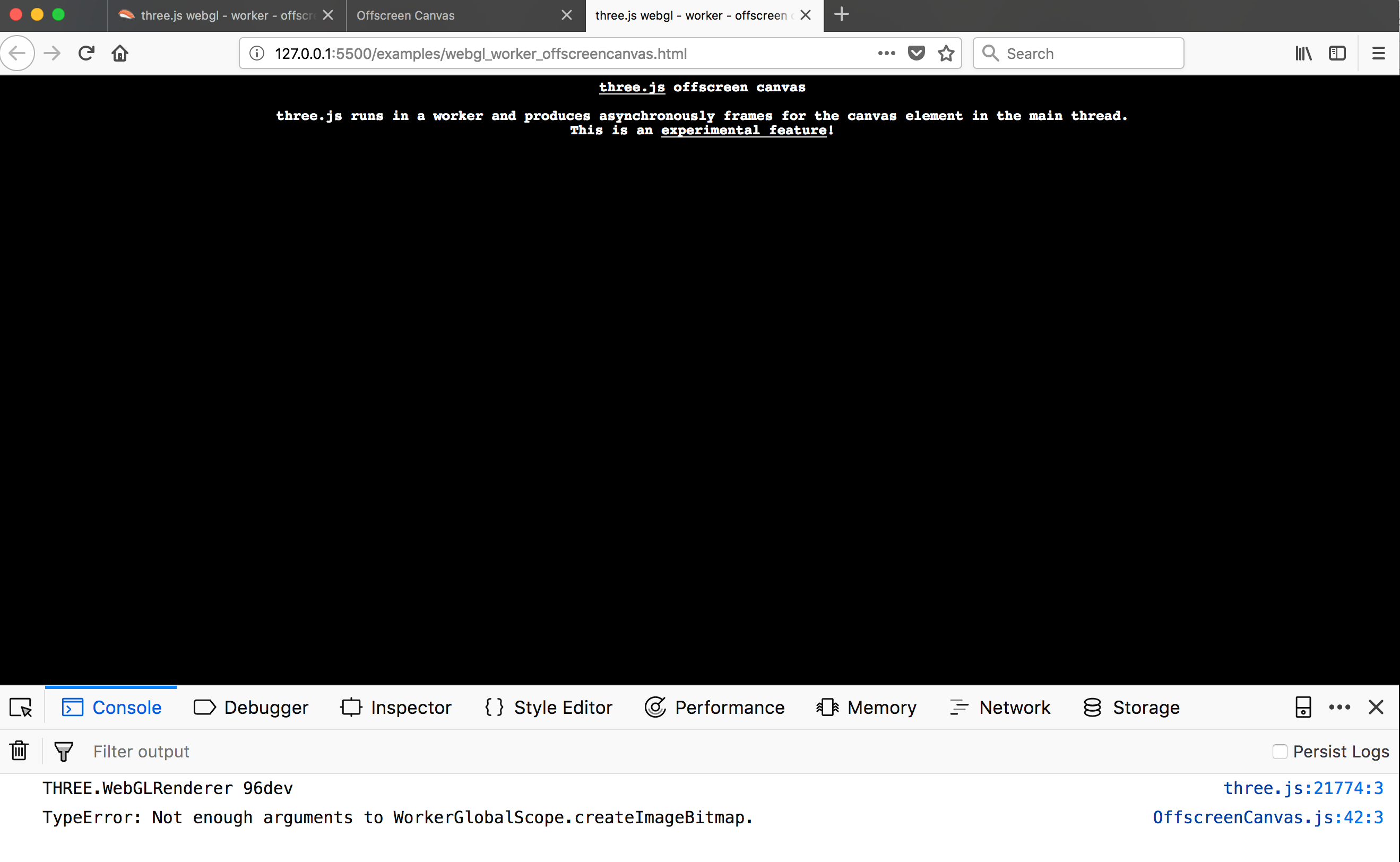 I'm rather sure it's about the createImageBitmap signature bug. Even if the options parameter is undefined, FF will still complains about the signature: Without the texture related changes in the example, the demo will not work in FF (it does not crash, it just stays blank and the error can be logged to console): This happens on current FF (61.0.2 (64-bit)). I think it would be nice if the demo run out of the box on FF, despite this bug, as the bug is not related to OffscreenCanvas itself. Do you think we can add this workaround? |