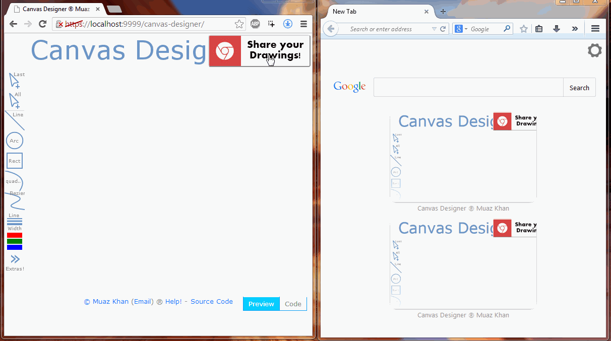 The specialty of this drawing-tool is that, it generates Canvas2D code for you; so simply draw and get the code! That code can be used in any javascript Canvas2D application.