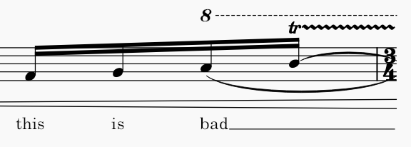 All lines (slurs, ties, melisma lines, hairpins, pedal markings, trills, etc.) should end at the position of the final barline of the system, with a sliver of padding, and not extend beyond it.
