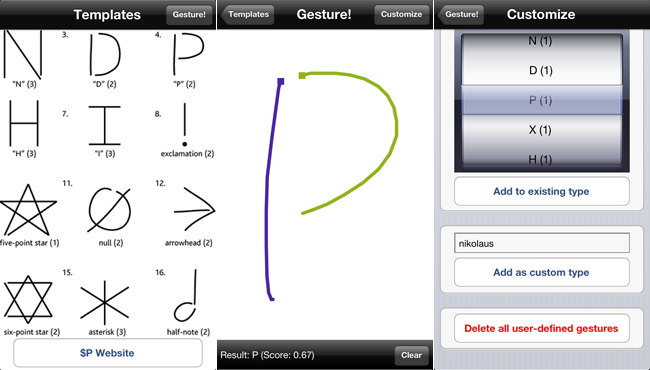 [dollarPGestureRecognizer setPointClouds:[DollarDefaultGestures defaultPointClouds]];When a gesture is recognized, a DollarPResult object contains the name and score of the gesture:
