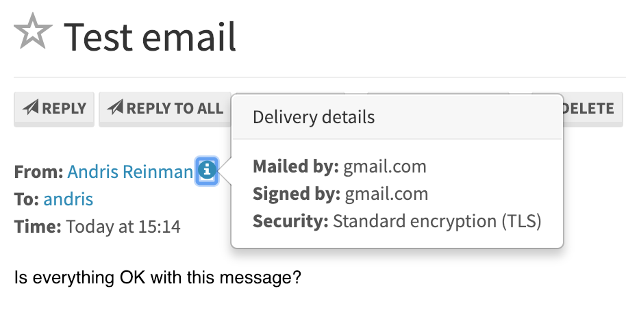 Message verification displays information about DKIM signature, SPF domain and TLS status in the last hop of transit.