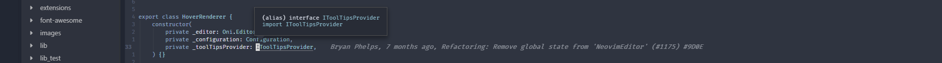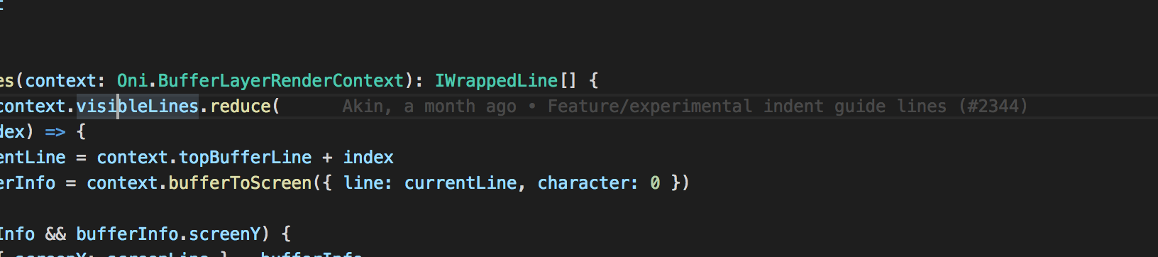 I enabled this a few days ago and it's working wonderfully. I really like how it finds nearby whitespace to render into - much less invasive than a pop-up that obscures code, or a split that reduces available window width. My one issue is that I use Oni with two vertical splits. This doesn't leave much room, and most of the space available is taken up with the author and time, when for me the message is more useful. Perhaps a future tweak would be some configuration as to the ordering of the fields? Maybe that can already be done with "experimental.vcs.blame.mode" config option? I haven't had chance to dive into the code to see what that does, though. |