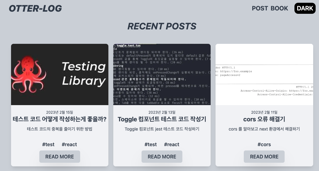 otter-log 나만의 블로그를 만들면서, 하나씩 배워가고 있습니다. 블로그를 만들던 이야기를 기록하고 있습니다. otter-log 실행하기 yarn && yarn install yarn dev 개발스택 TypeScript NextJS tailwind CSS 구현 목록 다크모드 Notion API 연동 Table of Contents 댓글 기능 필터 기능 필터 페이지를 추가해서, 필터기능 세분화하기 관련 포스트를 제공해주는 컴포넌트 구현 블로그를 만들면서 있었던일 meta 태그와 sitemap을 활용한 블로그 SEO 최적화 Notion API 사용기 Notion API 이미지 문제 해결하기 React에서 이미지 최적화 진행하기 Next/Image로 이미지 최적화 하기 Read More 버튼과 검색 최적화, 클립패턴 w3c validator로 마크업 개선하기 Next에서 번들사이즈 개선하기