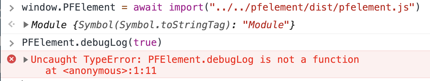 localStorage.pfeLog = trueand press enterlet {default:PFElement} = await import("../../pfelement/dist/pfelement.js");and press enterPFElement.debugLog(true)and press enterPFElement.debugLog(true)to an element of your choice. put the code right before your element's class statement.window.PFElement = await import("path/to/pfelement.js")and press enterBrowser requirements