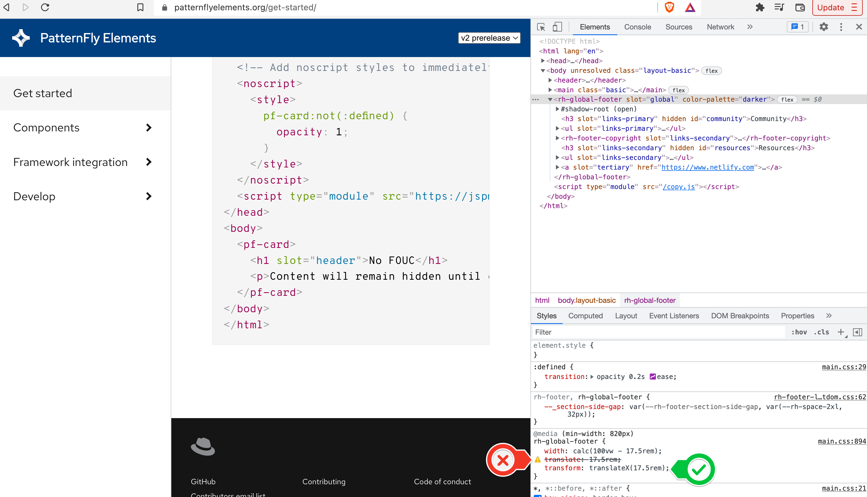 There is a bug in that the docs site footer should shift over when sidebar menu is open, but the CSS property is incorrect.