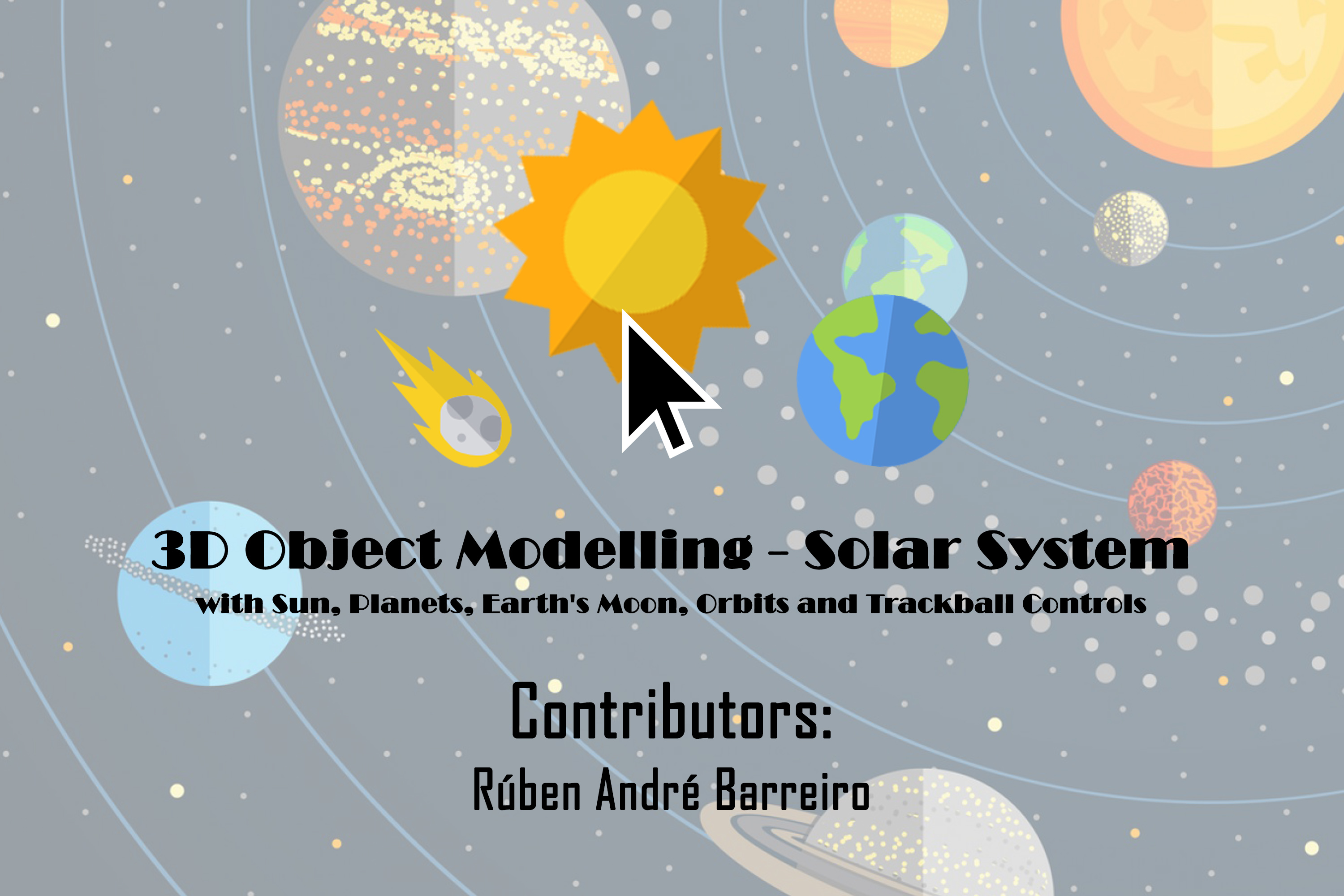 A project based in Computer Graphics and Interfaces, using 3D Modelling. This project was built using HTML (HyperText Markup Language), CSS (Cascade Style Sheets), JavaScript, JSON (JavaScript Object Notation), WebGL (Web Graphics Library), Three.js. The application gives a vision of our Solar System and all its elements, all using 3D Modelling and 3D Objects. Each element presented (Sun, Planets, Dwarf Planets and Earth's Moon) have its respectively information when the mouse hover above of each one!
