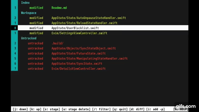 jmove one line downkmove one like upC-dJump half a page downC-uJump half a page up![Shift 1] Jump straight to the index section of the git status output.@[Shift 2] Jump straight to the workspace section of the git status output.#[Shift 3] Jump straeight to the untracked files section of the git status output.GJump to the bottom of the list.gJump to the top of the list.qQuit