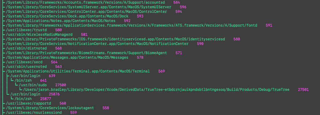 Major Update: Because of the ever changing features on macOS, since macOS 11 some features don't operate quite the same as they used to when I wrote the original blog post for TrueTree. Apple has introduced the addition of a new process "runningboardd" which ends up being the true parent of many processes. To get around this TrueTree was updated to use the Application Services framework which allowed for aquiring the true parent in some scenarios. However, this no longer allows for the aquiring of a true parent process if that parent process has terminated. Making it difficult to pinpoint some true parents such as the "open" command. A small price to pay to ensure TrueTree continues to operate across macOS releases. Some other signs of a true parent can often be found inside of the launchctl procinfo output. This might be taken into consideration in the future.
