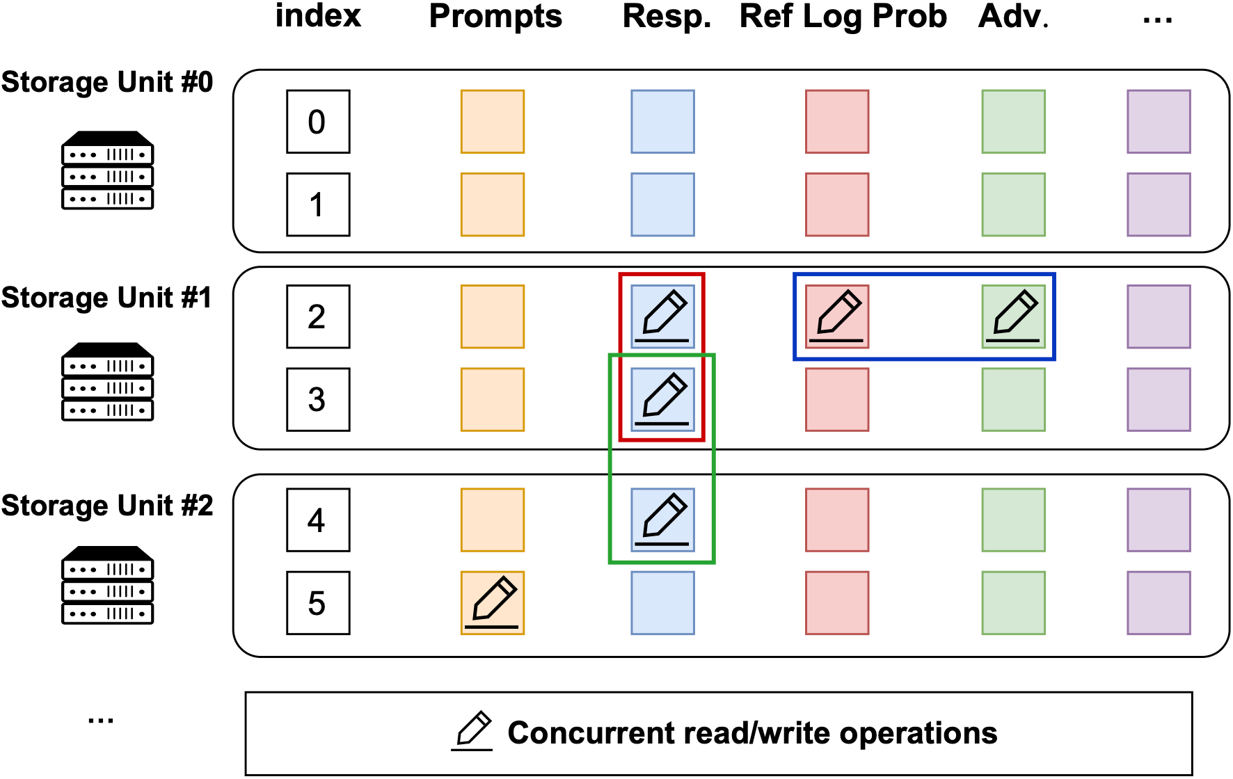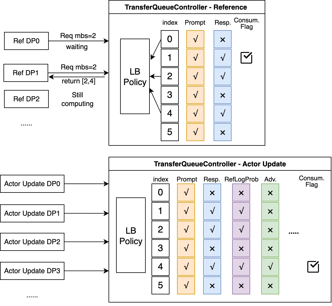 In the control plane, we track the production and consumption status of each training sample as metadata. When all the required computational tasks are completed (i.e., all column flags are set to ✅ for a given row), we know that this data sample can be consumed by downstream tasks. Note that each RL task requires different inputs, so we deploy task-specific controllers for each RL task. For example, reference inference only needs the prompt, while actor update requires prompt, response, old log prob, etc.)