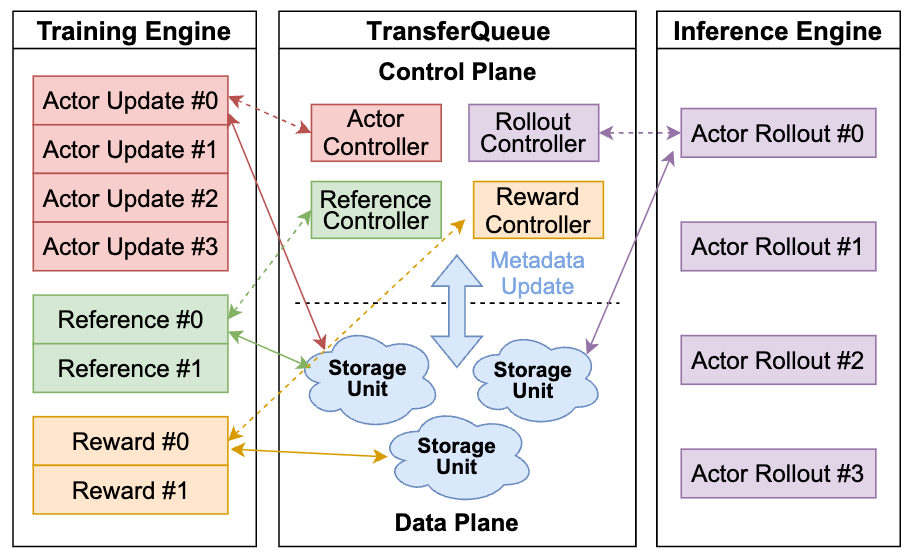 As illustrated below, TransferQueue acts as a streaming data scheduler bridging the training and inference tasks, managing the entire dataflow in the RL post-training process. The control plane maintains the fine-grained metadata of each training sample, while the data plane stores the actual data in a distributed manner.