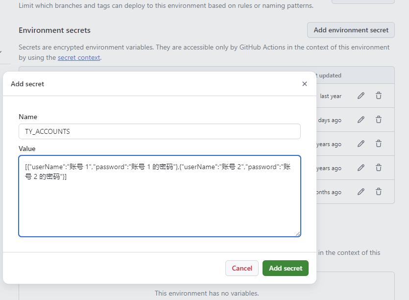 新版本的 git Action 需要创建 environment 来配合使用,创建一个名为 user 的环境