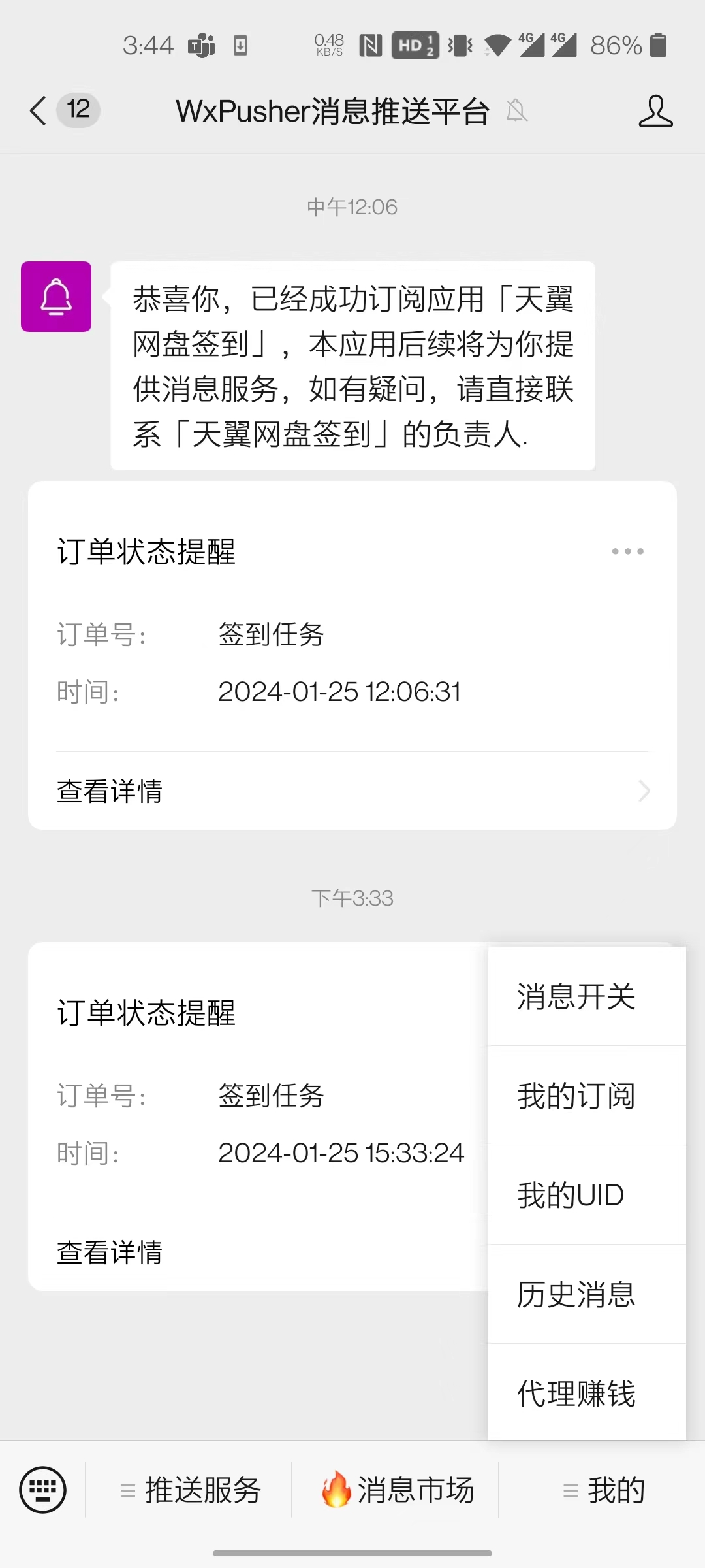 WX_PUSHER_APP_TOKENWxPuser 推送 AppTokenWX_PUSHER_UID接收推送 UID 默认使用是我的 WxPusher,你也可以改成你自己 wxPusher 开发者账户,修改 WX_PUSHER_APP_TOKEN. 如果想直接使用我的 wxPush 应用,请扫描底下二维码进行关联. https://wxpusher.zjiecode.com/api/qrcode/4Ix7noqD3L7DMBoSlvig3t4hqjFWzPkdHqAYsg8IzkPreW7d8uGUHi9LJO4EcyJg.jpg 然后拿到 UID 后,把 WX_PUSHER_UID 配成你拿到的 UID.