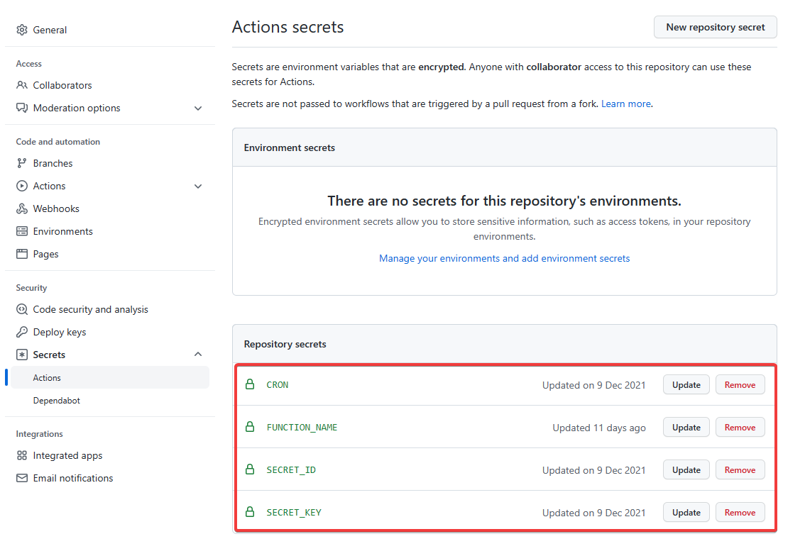 FUNCTION_NAME 为函数名,不填写默认为 NeteaseCloudMusicTasks。如需更改,则创建此 secret,并填写自定义的函数名,命名规则:只能包含字母、数字、下划线、连字符,以字母开头,以数字或字母结尾,2~60 个字符。