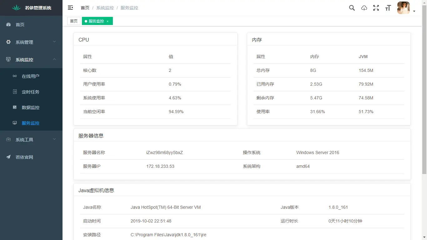 - 服务监控:监视当前系统CPU、内存、磁盘、堆栈等相关信息。