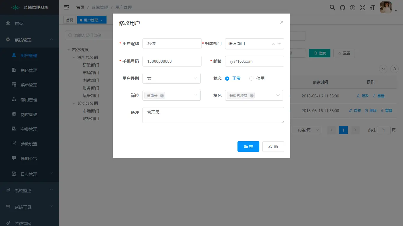 - 部门管理:配置系统组织机构(公司、部门、小组),树结构展现支持数据权限。