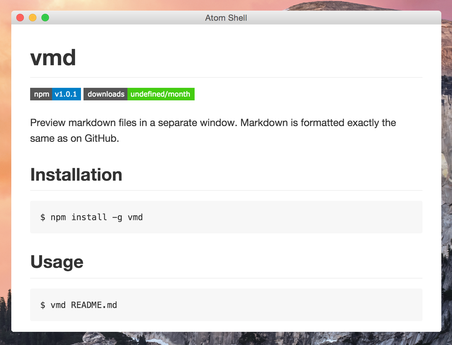 $ vmd node_modules/electron # opens node_modules/electron/README.mdIt reads from stdin so you can pipe markdown text in to it: