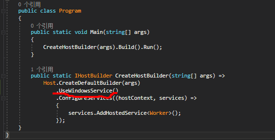 2.然后在program.cs内部,将UseWindowsService()添加到CreateHostBuilder