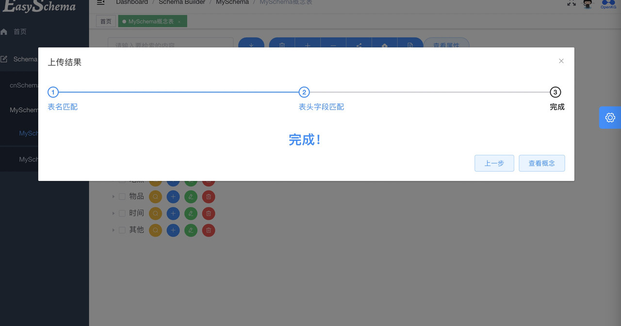 点击Myschema概念表,导入表格,进行模糊匹配查询