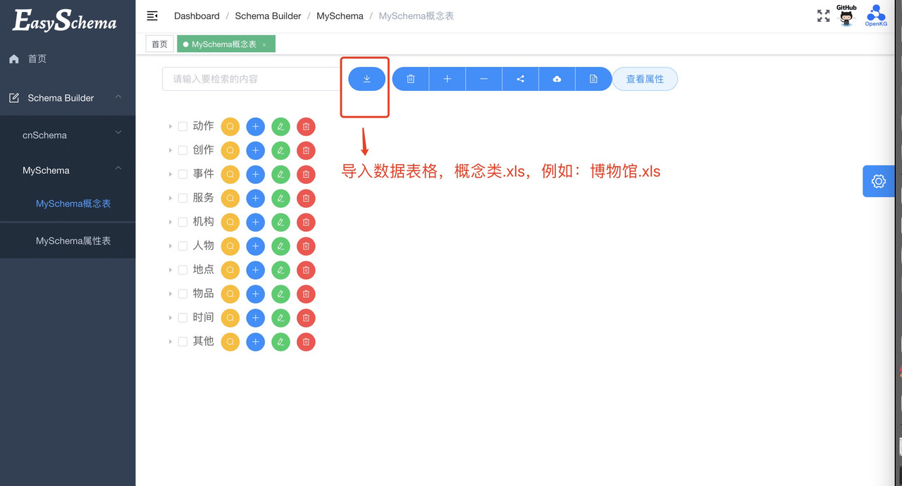 myschema概念表-支持增删改查的功能、导入/导出数据的功能、以及节点知识图谱可视化展示